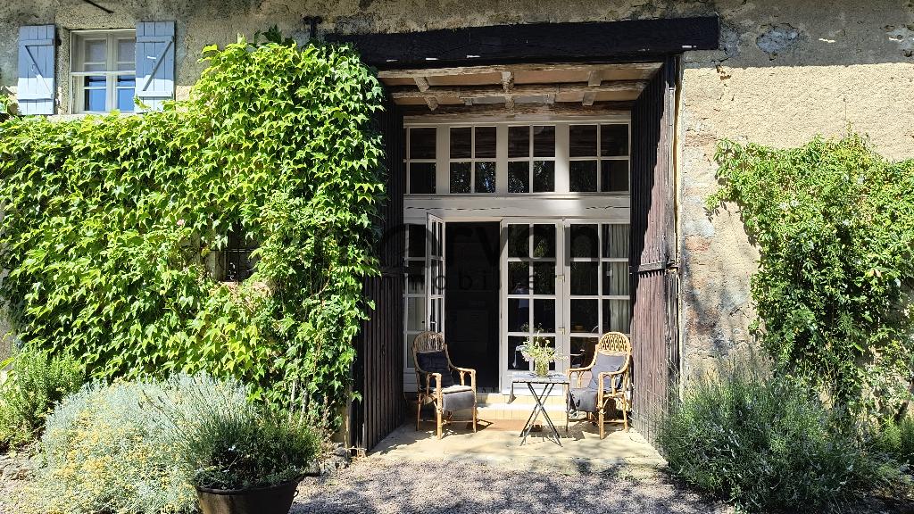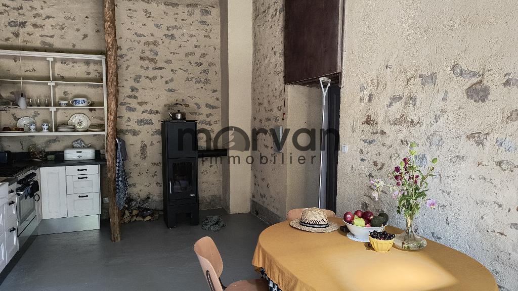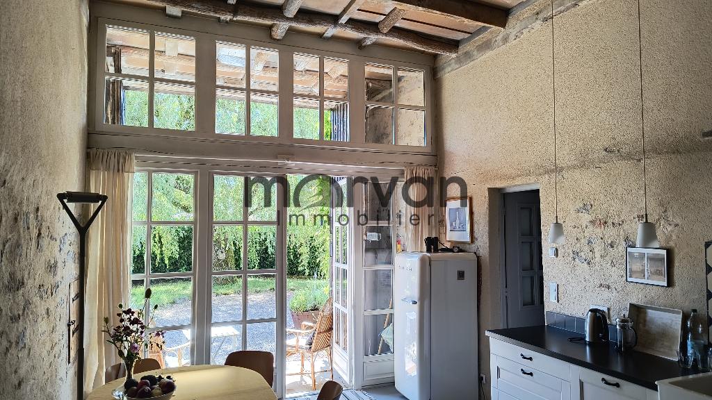Ancienne grange transformée en cuisine et séjour de 22 m2, cuisine équipée avec chauffage au sol. Grande belle vitrée ouvrant sur auvent et le jardin.