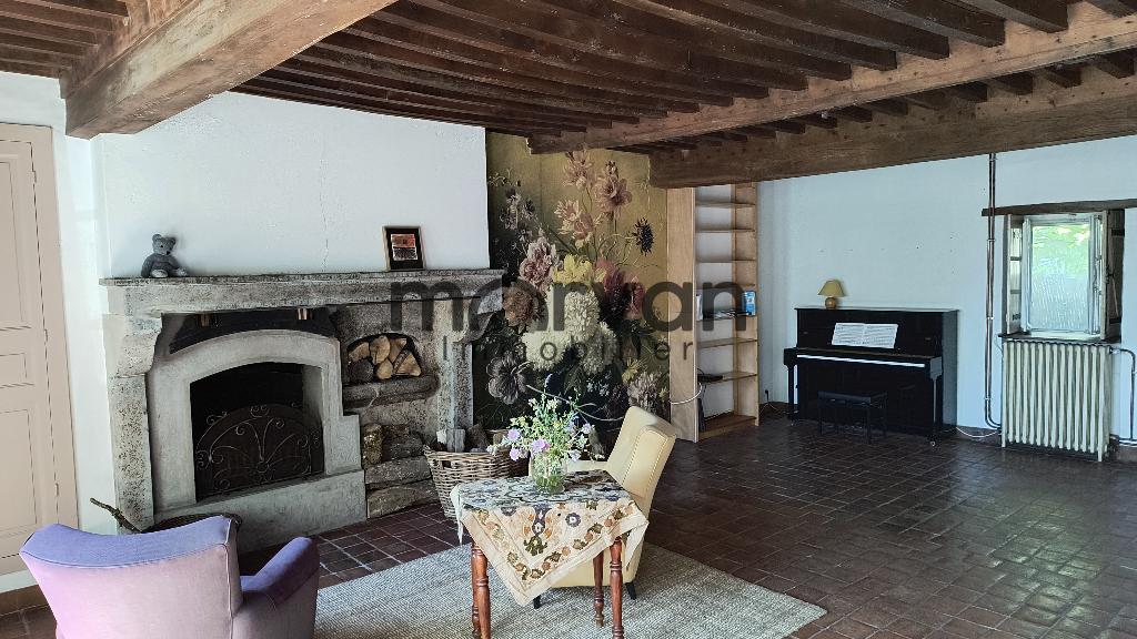 Hall d'entrée de 11m2 donnant accès à un grand salon d'environ 44m2 avec tomettes au sol, plafond à la française, une cheminée avec feu ouverte, deux fenêtres et porte exposée plein sud, avec survitrage.