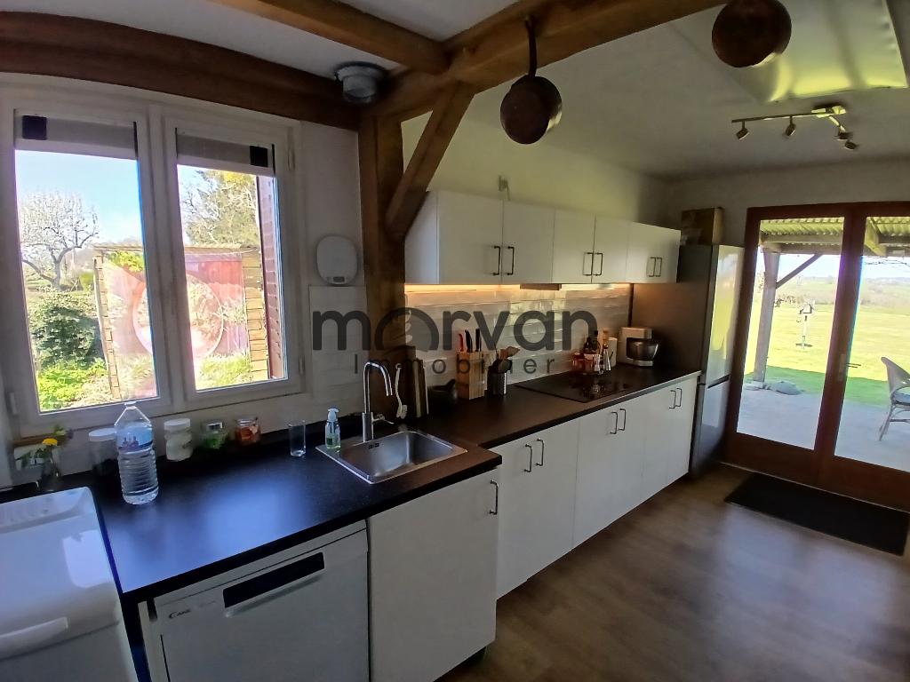Grande cuisine de 15m2 avec des portes fenêtres ouvrant sur une terrasse couverte de 23m2 avec une très belle vue sur la campagne.