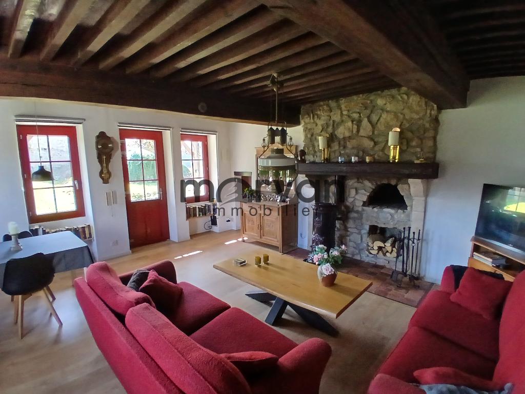 La deuxième, fort potentièle pour cette maison en pierre élevée sur cave avec 4 pièces et un grenier aménageable. Première maison (blanche) entrée par le séjour de 28m2, chauffage au sol, une cheminée avec four à pain et un accès au cellier.