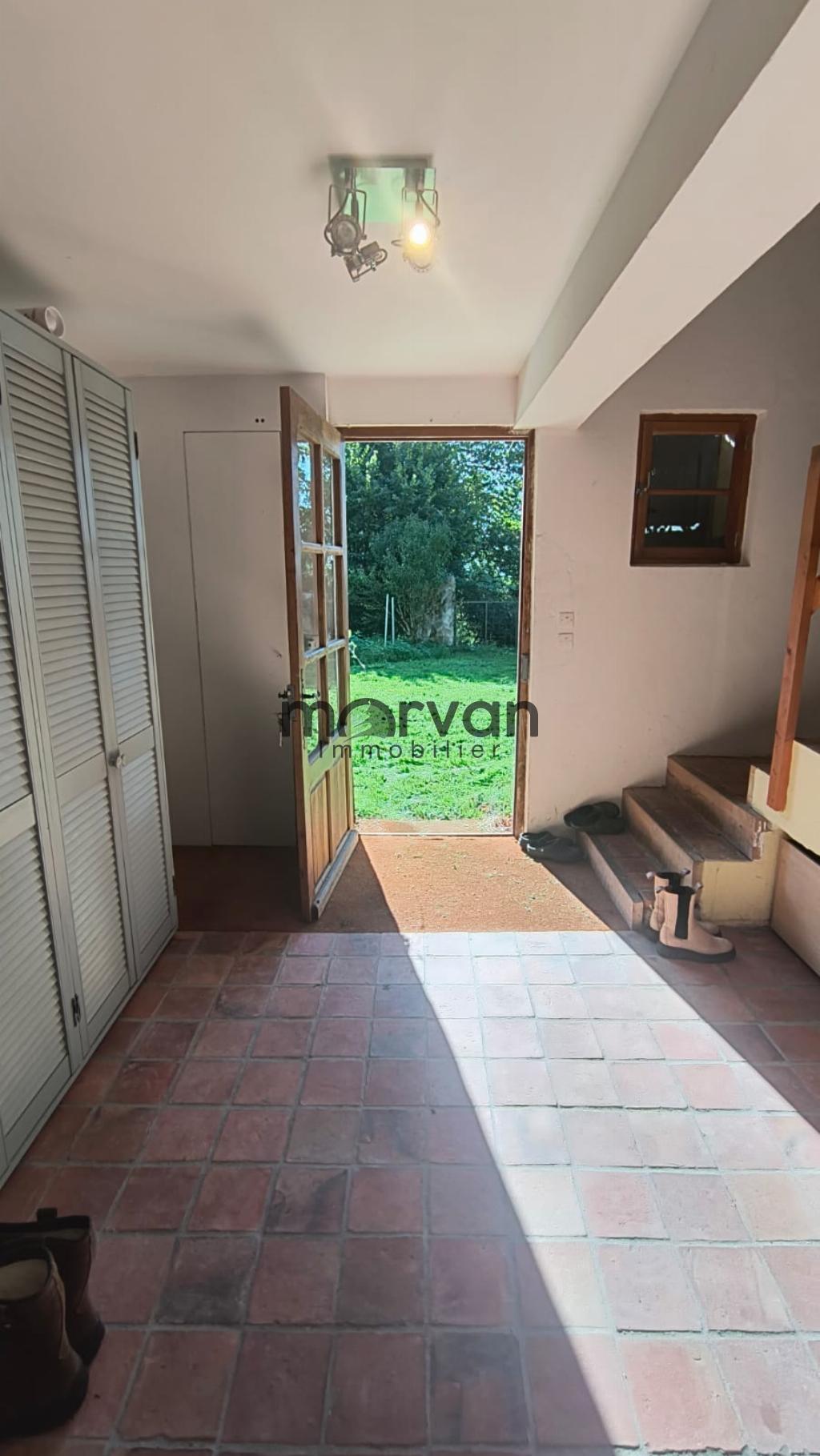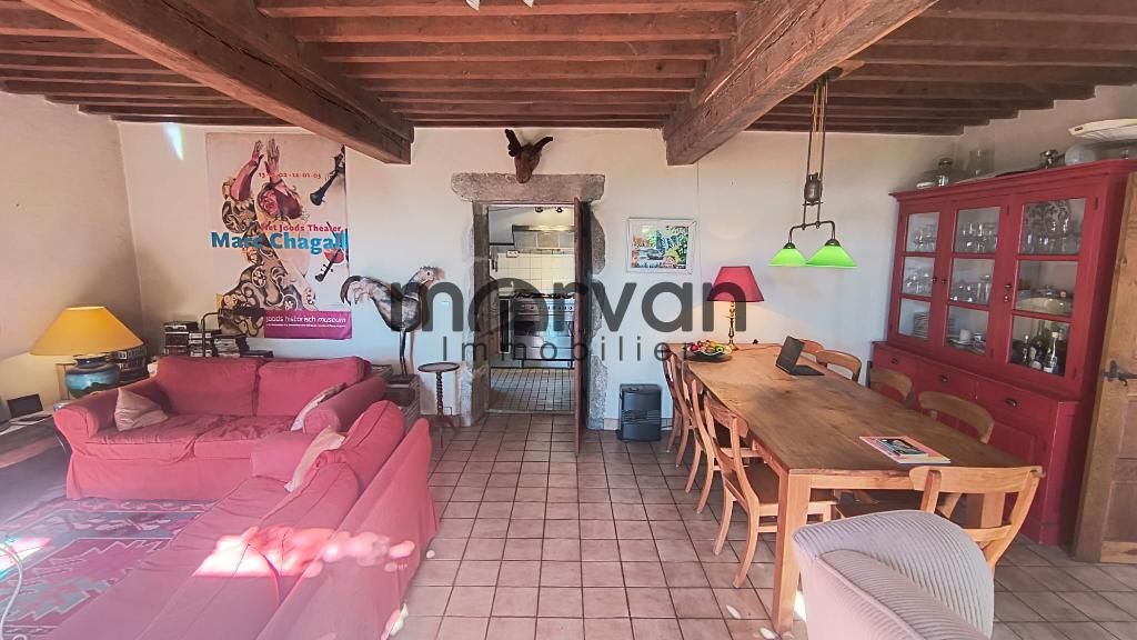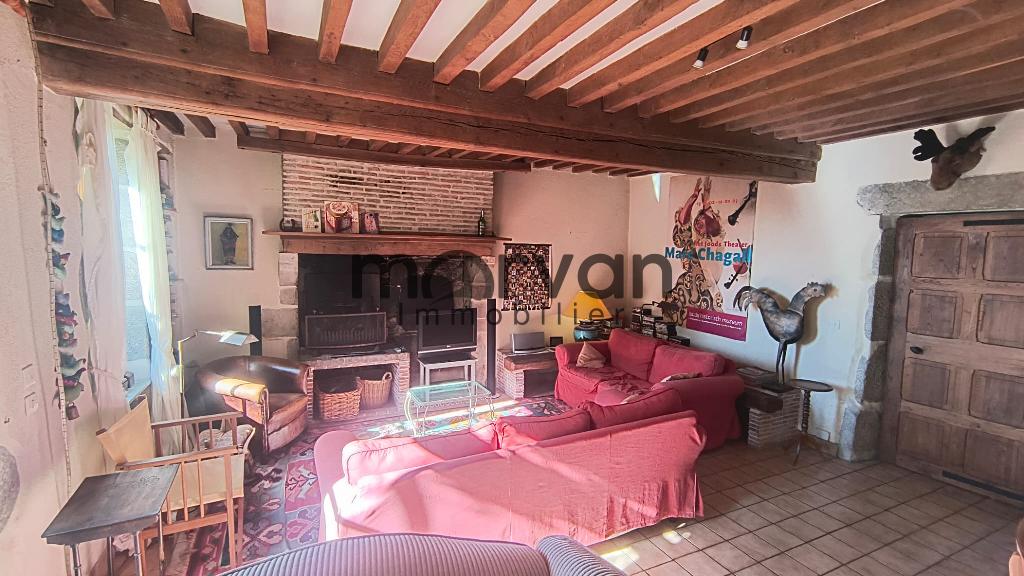 " Maison de campagne en partie élevée sur cave, entrée par séjour salon de 35m2 avec cheminée ouverte et poêle à bois. Cuisine de 11m2 bien équipée.W.C. Salle d'eau buanderie derrière la cuisine. Sortie depuis la cuisine vers la véranda d'environ 20m2. Avec une très belle vue.