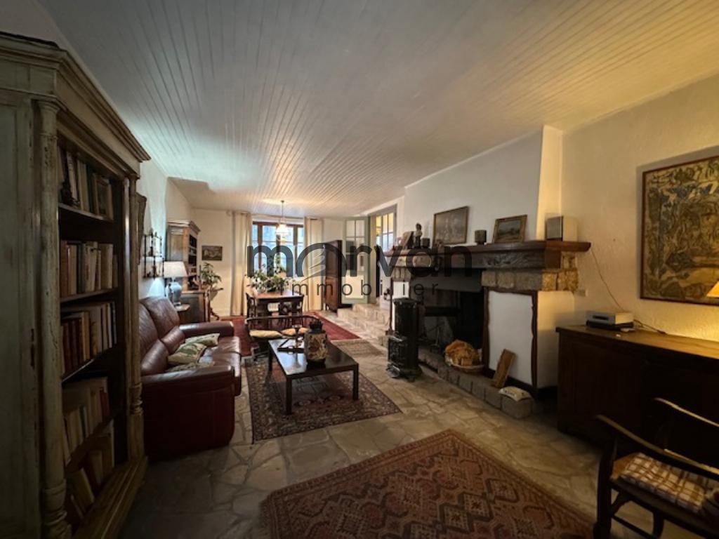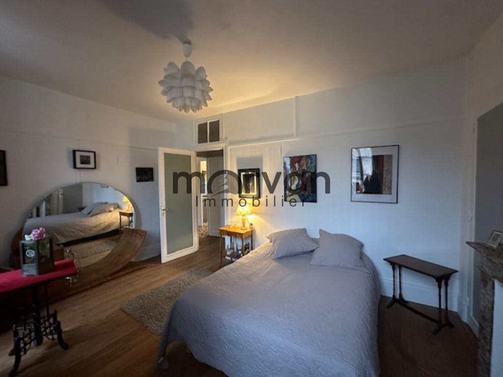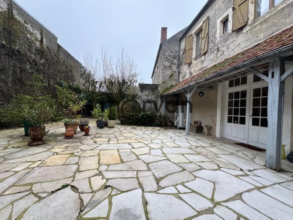 RDC : hall d'entrée, grande pièce de 35m2 donnant sur cour ensoleillée, 1er étage : cuisine aménagée, salle d'eau avec grand placard de rangement, salon avec magnifique cheminée en bois, 2 chambres parquetée dont une donnant sur la cour, 2ème étage : 2 chambres avec cabinet de toilette, petit grenier débarras, Chauffage par PAC et radiateurs fonte, double vitrage sauf au dernier étage. Grande cour dallée exposée sud avec cuisine d'été ,