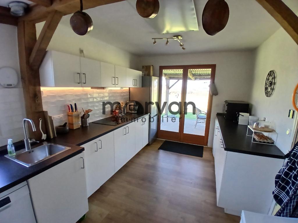 Grande cuisine de 15m2 avec des portes fenêtres ouvrant sur une terrasse couverte de 23m2 avec une très belle vue sur la campagne.