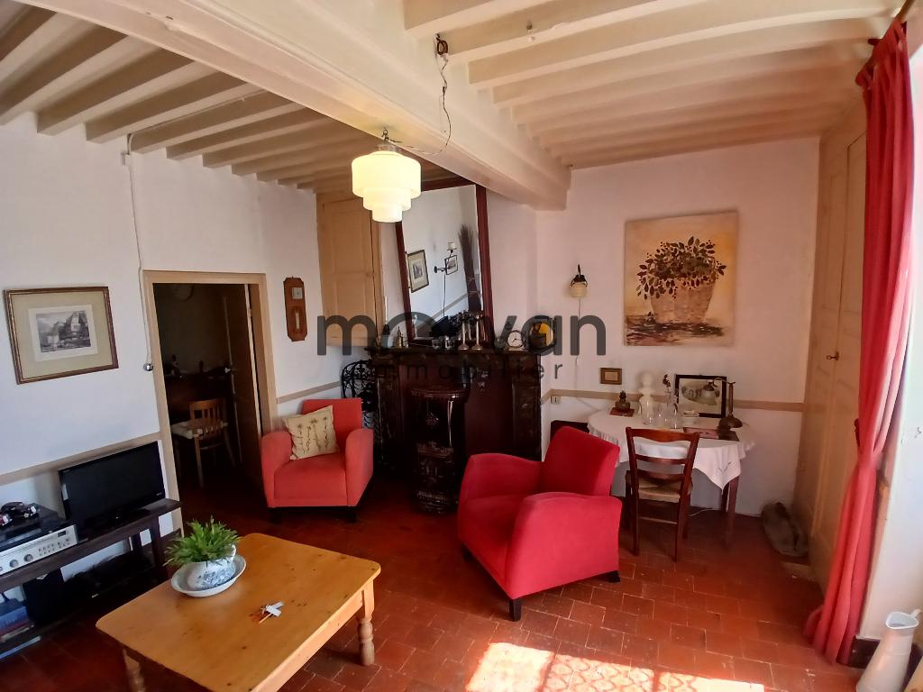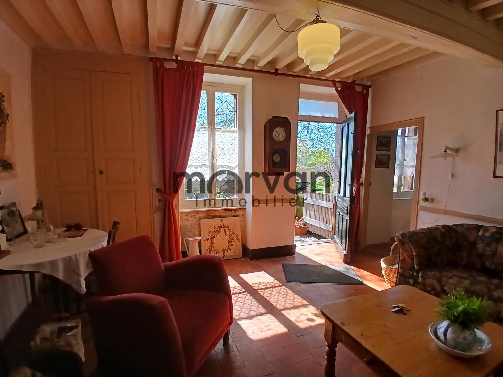 " En exclusivité dans notre agence, maison de plain-pied, entrée par le salon de 16m2 avec tomettes au sol et plafond poutraison avec cheminée et poêle à bois 'Godin'.